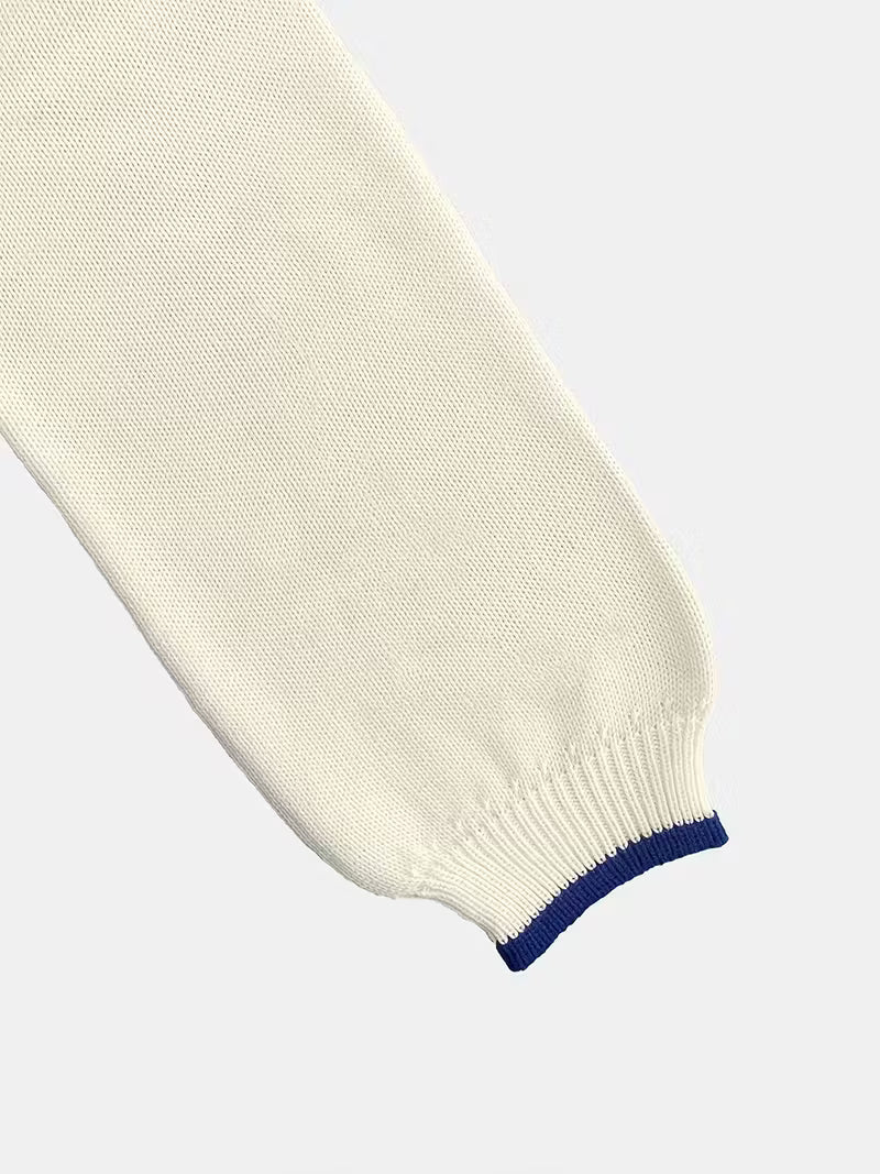 Cremefarbener Knit Pullover mit Fischmuster und marineblauem Saum, perfekt für die after-beach chill session oder für einen entspannten Moment auf der Terrasse. Wähle eine Nummer größer für einen oversized look – auch schön off-shoulder zu tragen.
